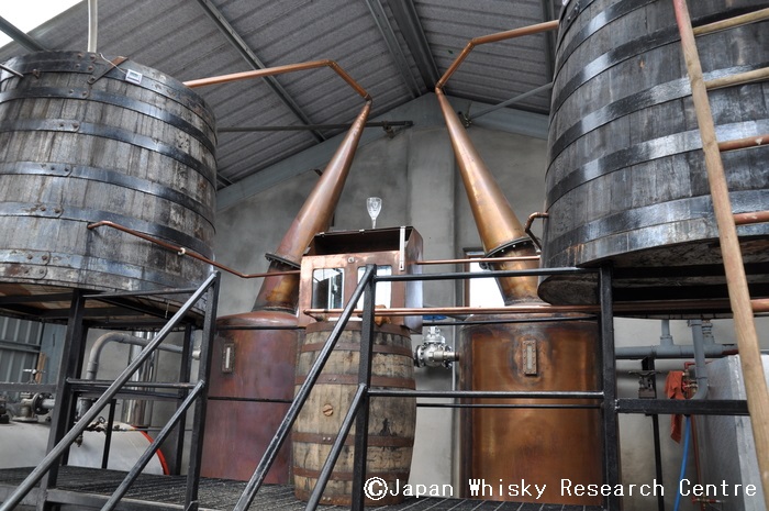 アビンジャラクは鮭のふ化養殖場の建物を改装して建てられているが、入って驚くのはそのスチルの異様な姿だ。まるでキリンの首のようなヘッドがついた、どこにもない形のスチルで、初留・再留それぞれ容量は2000リットルだという。マークさんによると、それはルイス島伝統の密造用スチル、ヒルスチルを再現したものだとか。つまりルイス島民はマセソンに禁止されていたにもかかわらず、長いこと谷に隠れて密造を続けてきたのだ。その時に用いたのが、ルイス独特のヒルスチルだという。