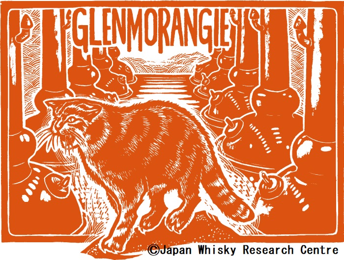 以前ウイスキーキャットとヤマネコについては千夜一夜でも紹介したことがあるが、今回は蒸留所版画シリーズの謎解き。グレンモーレンジィであしらったのが、スコッチで一番背が高いという(今はエジンバラのホーリルード蒸留所に抜かれたが)スチルとヤマネコだ。モーレンジィのスチルはネックの高さが5.14mもあり、それが12基並ぶ様は壮観だ。もともとジン用の中古だったスチルで、スチルハウスの美しさでは、モーレンジィが一番だと思っている。ヤマネコはハイランドに棲息する絶滅危惧種で、蒸留所を創業したサザーランド公爵の副紋章でもある。モーレンジィには「カドボールハウス」というカントリーホテルがあり、そこの玄関ホールに、このヤマネコのハク製が飾られていた。カドボールという地名も、ノース語(ヴァイキングの言葉)で、ヤマネコの草原の意味だとか。