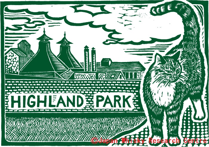 ヤマネコではないが、ウイスキーキャットで有名だったのが、オークニーのハイランドパーク蒸留所だ。ハイランドパークはカークウォールの高台に1798年に創業した蒸留所で、今でもフロアモルティングを続ける数少ない蒸留所のひとつ。当然、ネズミの天国となっていて、歴代のウイスキーキャットが活躍した。版画にあしらったのは、2000年代に交通事故死した、名物キャットのバーレイだ。バーレイは大麦のことで、文字通り黄金色をしていた。相棒のモルトと一緒にネズミを獲っていたが、人間も大好き(?)で、気が向くとツアー客を案内して蒸留所を廻っていた。