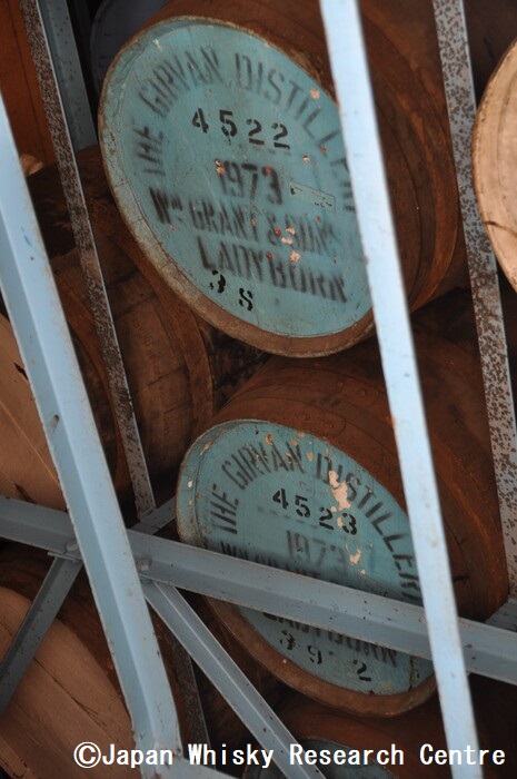 レディバーンは初留・再留2基ずつの計4基のスチルが稼働したが、親会社のウィリアム・グラント&サンズ社はスペイサイドにグレンフィデック、バルヴェニーを所有していて、レディバーンは当初よりブレンデッドの原酒という扱いだった。そのため生産も不定期で、しかも1975年にはグレーン設備の拡張で取り壊しにあっている。つまり存命期間は、わずか9年のみで、「最も短命に終わった貴婦人」と言われているのだ。それでも通常こうしたマイナーな蒸留所は、ボトラーズが樽を持っていたりするのだが、それも現在はほぼゼロ。あったとしてもレディバーンという名称は使えない。かつてシグナトリーが一度だけボトリングしたことがあるが、それは「エアシャー」という名前だった。現在レディバーンの樽を所有するのはグラント社だけで、ガーヴァンの集中熟成庫に10数樽しか残っていないという。それが下の写真だが、いつボトリングされるのやら…。