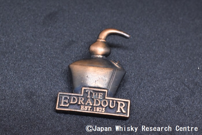 それはさておき、スチルのピンバッジで、コニサー以外で一番気に入っているのが、エドラダワーとマッカランのピンバッジだ。エドラダワーのピンバッジは、まずその大きさがスゴイ。ずしりと重く、止める針が2本ついているという変わり種だ。これも1990年代初めに買ったもので、その後何度も訪れているが、一度も見たことがない。1回作っただけで、その後オーナーも変わり(現在はボトラーズのシグナトリー社の所有)、気が変わったのだろう。