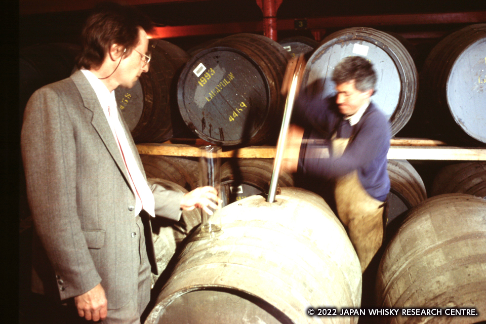 ボウモアやブナハーブン、ブルックラディの所長は地元アイラの出身者が多かったが、ディアジオのラガヴーリンと、当時業界第2位だったアライドのラフロイグの所長は、島外出身者が多かった。マイクさんも初対面の印象は、エジンバラやグラスゴーなどの都会育ちと思われた。いつもイタリア製のスーツを着て、ハデなネクタイ、そしてチェーン付きの眼鏡がトレードマークだった。どこかニヒルなところがあり、フランス製のタバコ、ゴロワーズがよく似合っていた。案内してくれても、製造の説明には熱が入らなくて、どこかつまらなそうにしていた。「アイラは退屈でしょうがない。ここには娯楽が何ひとつない。君もアイラに来て退屈だろう」と言うのが口癖だった。「俺の話より君の話をしてくれ。どうしてアイラに来た、東京はどんな所だ…」。