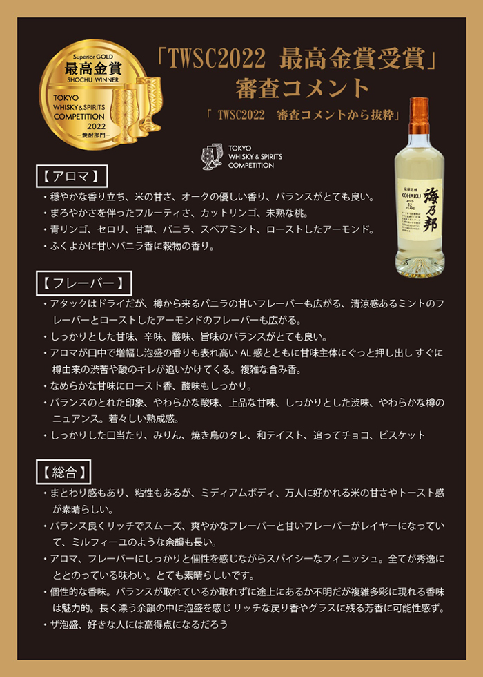 - 洋酒部門と違い、最高金賞を受賞しているものでも普通に酒屋で購入できる商品が多い点に驚きました。このような品評会があることで売場での接客に大いに役立っています。その道のプロがブラインドで評価した結果、高い評価を得たことは一般消費者に対しても分かりやすい指標の1つだと感じます。(酒販店/東京都N)